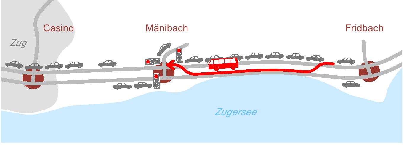 Wie funktioniert die elektronische Busspur? Im konkreten Fall der Artherstrasse wird am Knoten Mänibach eine Lichtsignalanlage installiert. Deren Ampeln können von den stadteinwärts fahrenden Bussen mit Fernsteuerung auf Rot geschaltet werden, falls zwischen den Knoten Fridbach und Mänibach ein Stau besteht. Sobald der stadtauswärts fahrende Verkehr auf dem erwähnten Abschnitt abgeflossen ist, wird die Gegenfahrbahn für den Bus frei gegeben. Dieser kann nun die wartenden Fahrzeuge überholen und vor der Kolonne direkt in die Haltestelle Mänibach einfahren. Aus Sicherheitsgründen ist das Ausscheren der Busse nur dort erlaubt, wo sich die Gegenfahrbahn vollständig überblicken lässt. Damit das System gefahrlos funktioniert, braucht es weitere flankierende Massnahmen. So müssen die privaten Ausfahrten in die Artherstrasse mit separaten Lichtsignalanlagen in das Steuerungssystem eingebunden werden. Weiter ist der Rad-Gehweg seeseits der Artherstrasse durchgängig auf drei Meter zu verbreitern, damit die Radfahrenden getrennt vom motorisierten Verkehr zirkulieren können. Und schliesslich gilt es, im Abschnitt Fridbach - Mänibach die öffentlichen Parkplätze aufzuheben. Der Entscheid dafür liegt beim Stadtrat von Zug.
