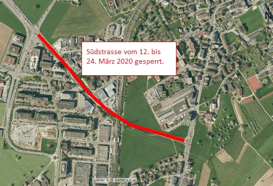 Vom 12. bis 24. März 2020 wird der Verkehr auf der Südstrasse in Baar lediglich von der Zuger- zur Weststrasse fliessen. Der Verkehr von der Autobahn in Richtung Zugerstrasse wird für diese Zeit umgeleitet.