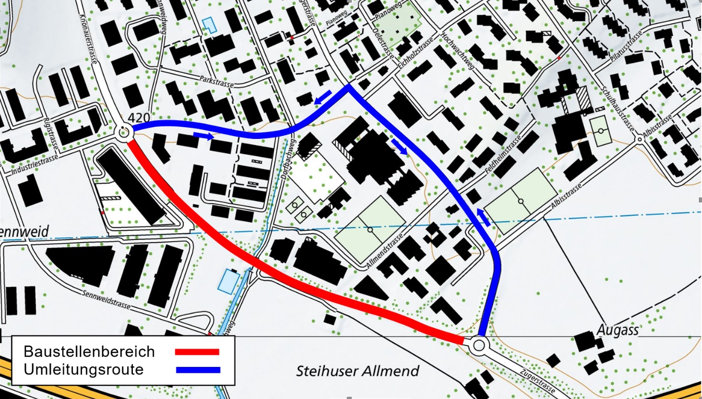 Die Umleitung für den Strassenverkehr erfolgt in beide Fahrtrichtungen auf der Strecke Kreisel Augasse–Knoten Zuger-/Industriestrasse–Industriestrasse–Kreisel Industriestrasse und wird signalisiert. Zur Sicherheit aller Verkehrsteilnehmerinnen und Verkehrsteilnehmer wird bei einigen Konfliktpunkten zusätzlich ein Verkehrsdienst eingesetzt. Da die Durchführung der Bauarbeiten vom Wetter abhängig ist, können Verschiebungen nicht ausgeschlossen werden. Über die genauen Bautermine informiert das kantonale Tiefbauamt frühzeitig. Entsprechende Hinweise finden sich auf der Webseite www.zg.ch/baustellen. Die Bauherrschaft trifft die nötigen Vorkehrungen, um Verkehrsbehinderungen auf ein Minimum zu beschränken.