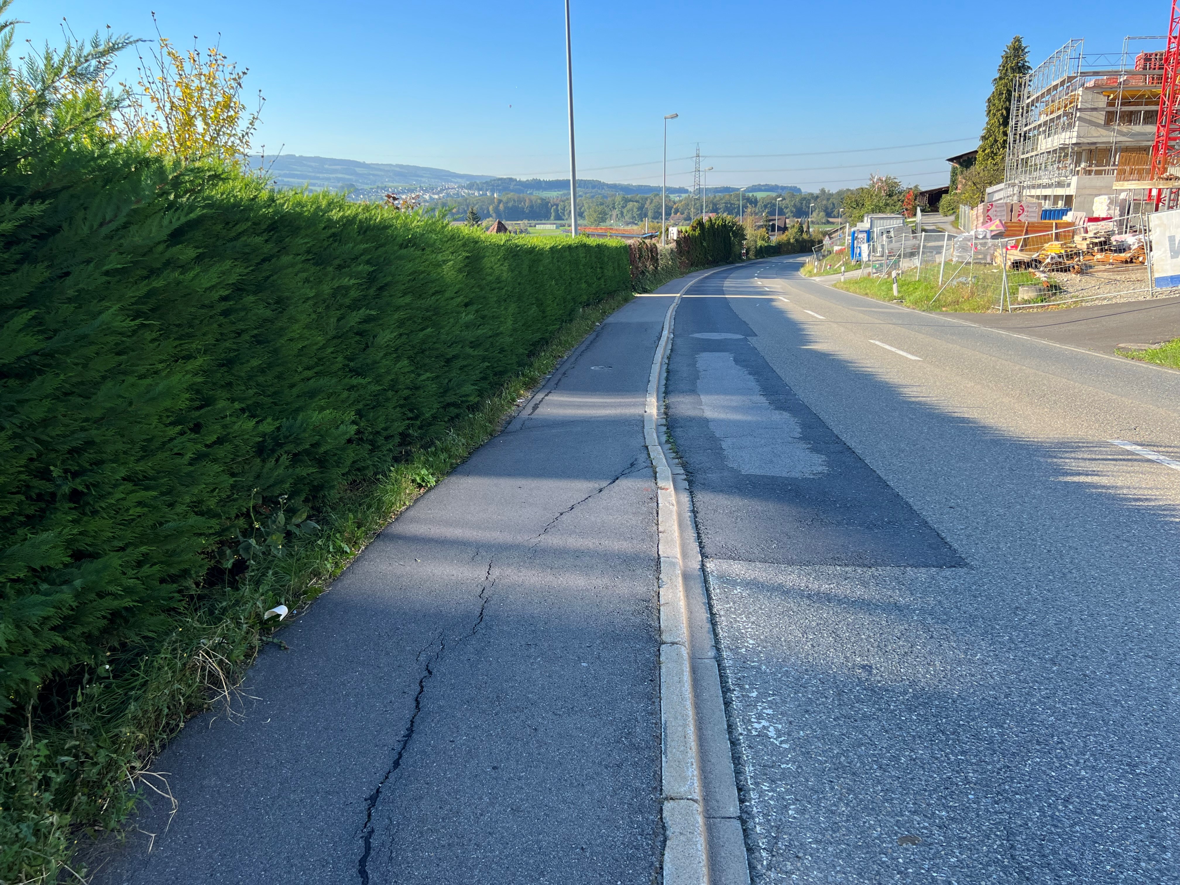 - Die Fahrbahn des talseitigen Trottoirs der Drälikerstrasse in Hünenberg weist aufgrund von Setzungen grössere Verschiebungen in horizontaler und vertikaler Richtung auf.