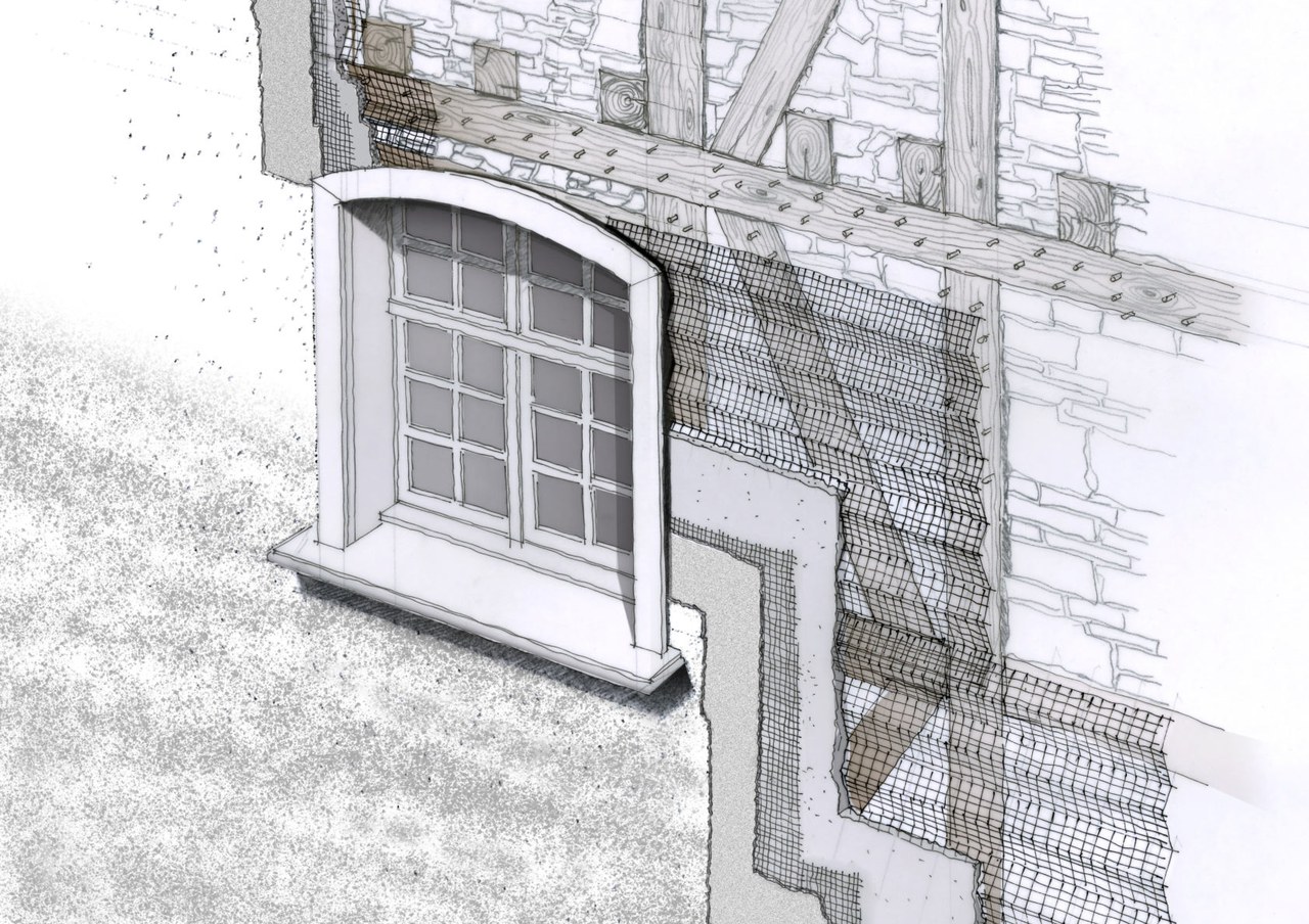 Skizze Putzaufbau: Nach der Entfernung des alten Putzes zeigten sich die unterschiedlich materialisierten Bauetappen: Bruchsteinmauerwerk mit Steingewänden, Fachwerk mit Holzgewänden. Da das Fachwerk historische Putzträger aufwies, entschied man, den Bau wieder zu verputzen. Zeichnung: André Bolliger