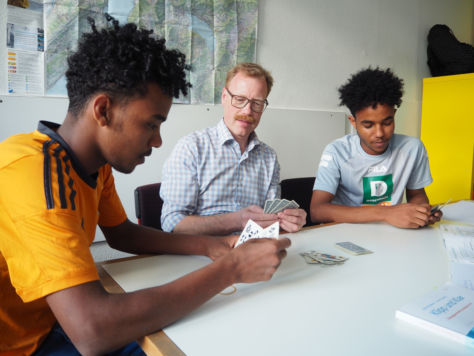 Integration via Jasskurs: Bei einem gemeinsamen «Tschau Sepp» mit Regierungsrat Andreas Hostettler lernen zwei eritreische Flüchtlinge spielend Deutsch und erhalten gleichzeitig eine Lektion in Schweizer Volkskultur.