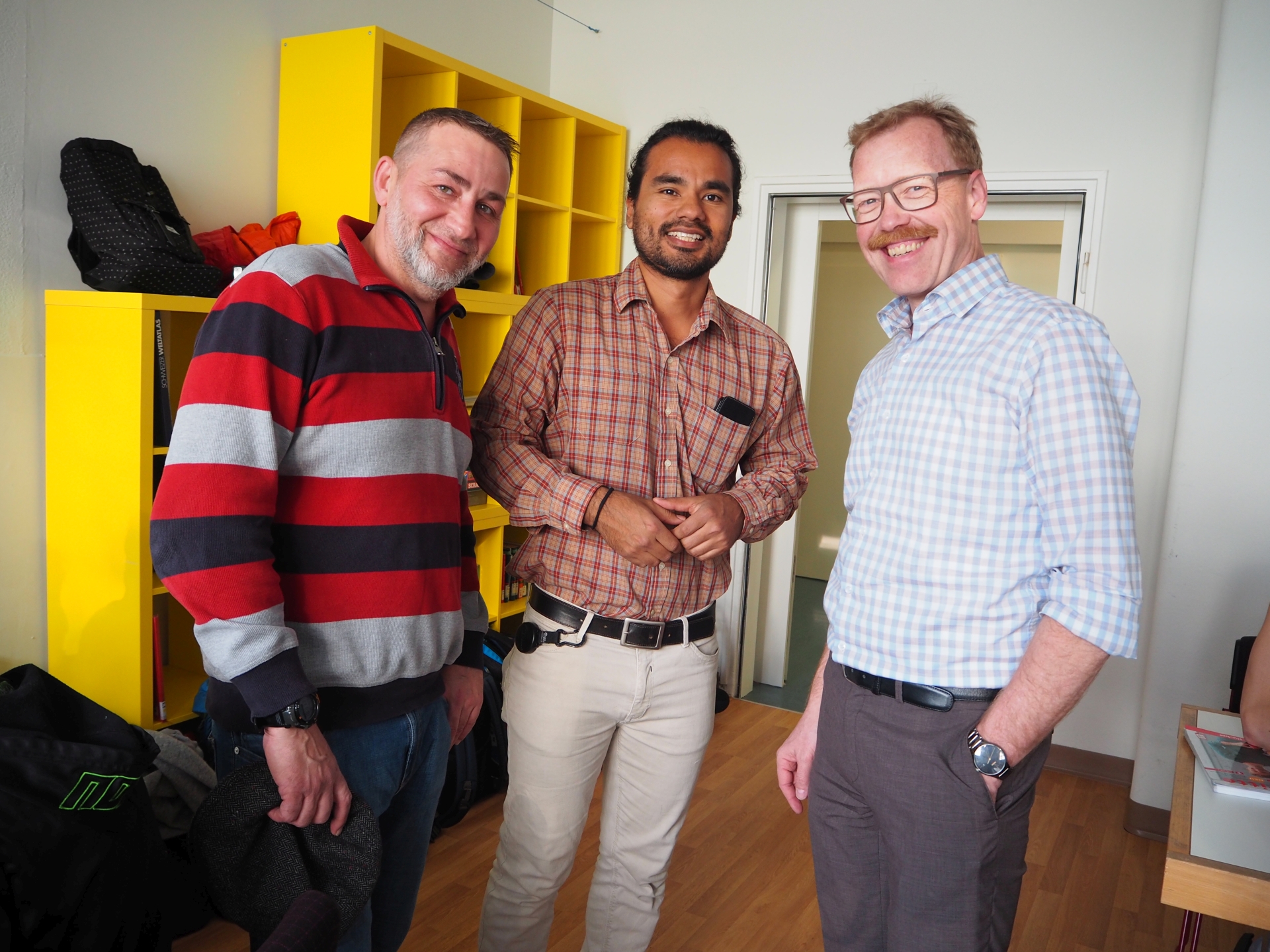 Elbrus Batsiev, Leiter der Asylunterkunft an der Artherstrasse in Zug und Ismael Fernandez, Aufsichtsperson in der Asylunterkunft, freuen sich mit Regierungsrat Andreas Hostettler über den gelungenen Start der Lernwerkstatt.