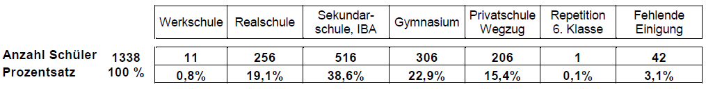 Beim Übertritt I am Ende der Primarstufe werden die Schülerinnen und Schüler in die vier Schularten Werk-, Real- und Sekundarschule sowie Langzeitgymnasium zugewiesen. 1338 Schülerinnen und Schüler der 6. Primarklasse absolvierten das Verfahren. Das entspricht dem zweithöchsten je festgestellten Schülerbestand.