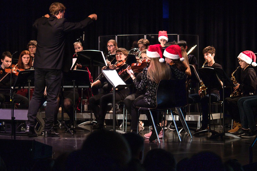 Die diesjährige Weihnachtsfeier gestaltet und musiziert von Schülerinnen und Schüler unterschiedlicher Stufen stand im Zeichen von Dunkelheit - Licht - Hoffnung. Musik, Gesang und Text nahmen dieses Thema auf und verarbeiteten es auf unterschiedliche Art und Weisen. So erklang zum Beispiel das Lied "The Snow" von Edgar William Elgar gesungen vom Vocal Joy, oder "Drei Nüsse für Aschenbrödel" von Karel Svoboda / Guido Klaus gespielt vom Orchester Arcanti oder das mit der ganzen Schule gesungene Lied "Oh du Fröhliche" begleitet vom Arcanti. Im vorgetragenen Poetry Slam wurde die Wichtigkeit unterstrichen, dass jede und jeder zum KSM-Spirit Sorge tragen soll, in dem die kleinen Gelegenheiten genutzt werden, um zu zeigen, dass alle an der KSM Teil der Schulgemeinschaft sind. Mit einem Dank an alle insbesondere an die Arbeiten, die in der Verwaltung geleistet werden, schloss Prorektorin Katharina Pretnar diese Feier ab.