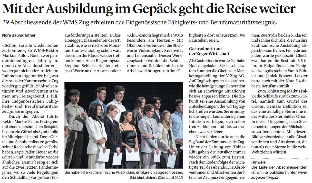 29 Abschliessende der WMS Zug erhielten das Eidgenössische Fähigkeits- und Berufsmaturitätszeugnis