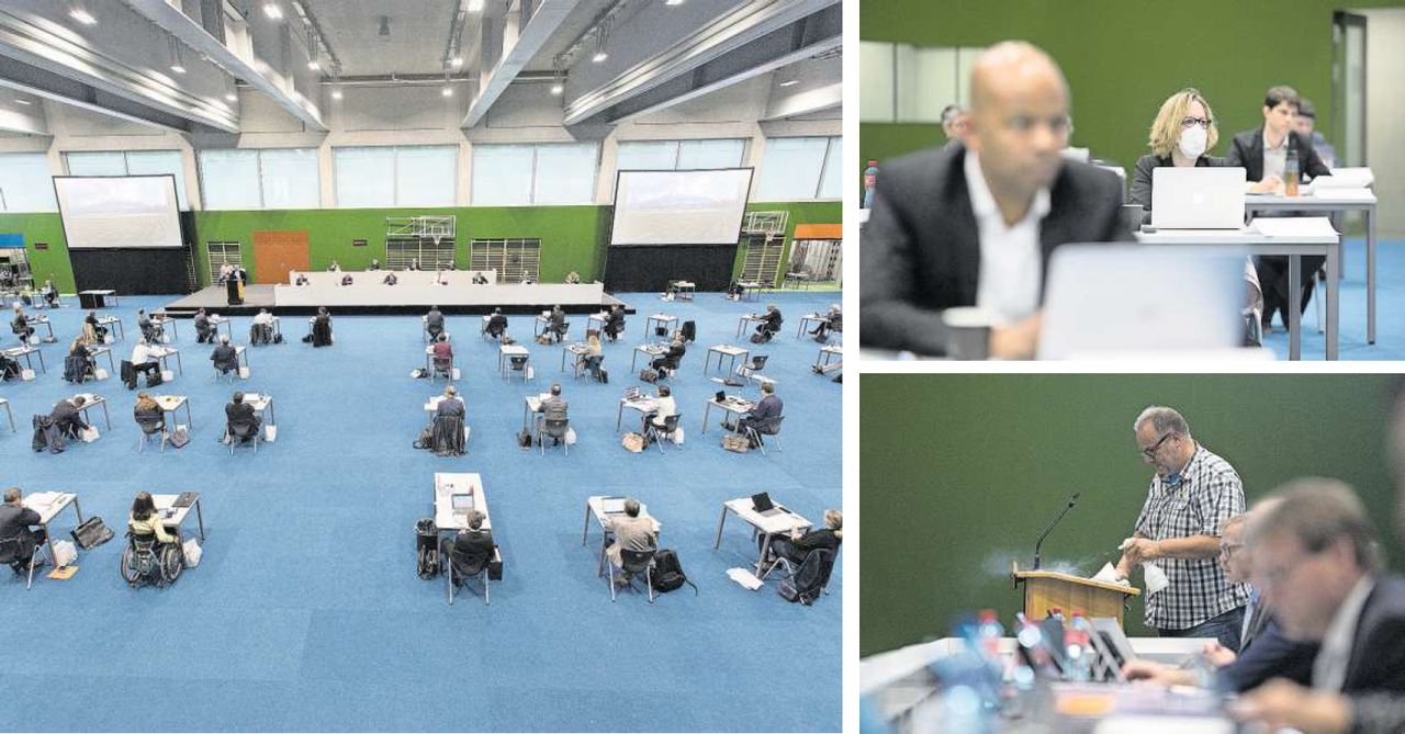 Dass es nicht so wie immer sein wird, ist nicht nur der Lokalität geschuldet: Bereits auf dem Weg über den Pausenplatz empfangen Polizisten die Parlamentarier und Medienschaffenden. In das Gebäude gelangt man durch verschiedene Eingänge. Die Polizistin, welche die Akkreditierung überprüft, sitzt hinter einer Plexiglasscheibe und trägt einen Mundschutz. Im Regierungsgebäude sitzen die Medienschaffenden neben dem Regierungsrat und können Reaktionen auf Voten direkt auf den Gesichtern der Parlamentarier ablesen. Es wird gelacht und geflüstert, bei Unstimmigkeiten den Kopf geschüttelt oder zustimmend gestikuliert.