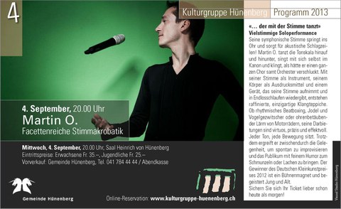 Martin O. tanzt die Tonskala hinauf und hinunter, singt mit sich selbst im Kanon und klingt, als hätte er einen ganzen Chor samt Orchester verschluckt. Mit seiner Stimme als Instrument, seinem Körper als Ausdrucksmittel und einem Gerät, das seine Stimme aufnimmt und in Endlosschlaufen wiedergibt, entstehen raffinierte, einzigartige Klangteppiche.