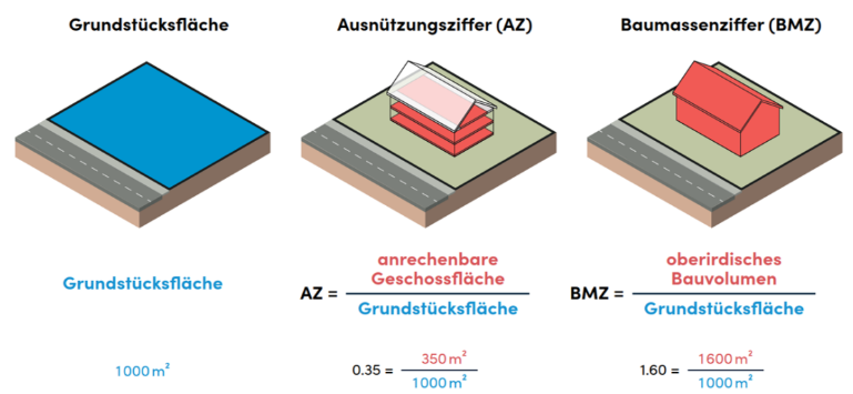 Die bauliche Dichte gibt Aufschluss über die gebaute Masse. Sie beschreibt, wie dicht ein Grundstück mit Gebäuden überbaut ist. Je höher die Ziffer, desto höher die bauliche Dichte. In den Wohnzonen wird für die bauliche Dichte die Ausnützungsziffer und in den Arbeitszonen die Baumassenziffer verwendet.