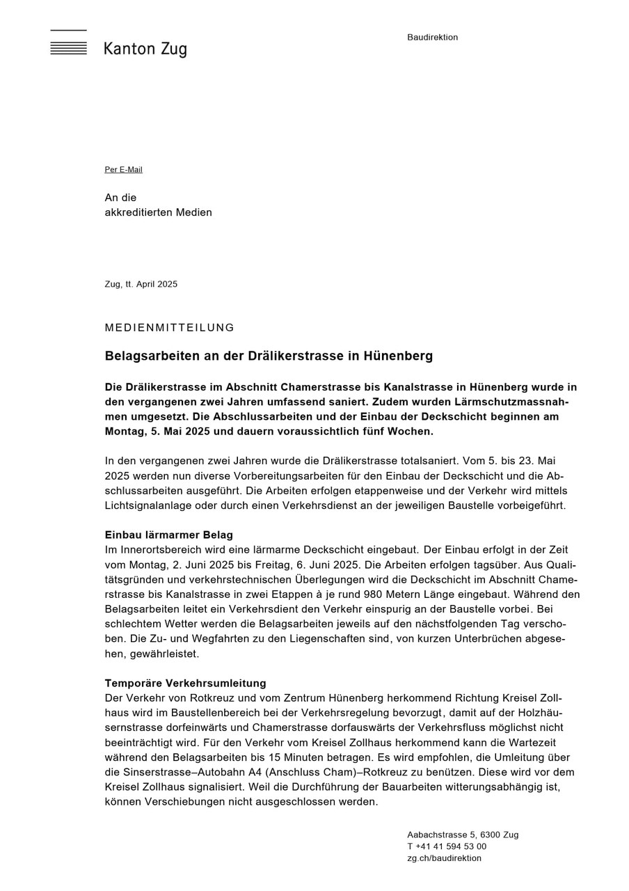 02.05.2025Belagsarbeiten an der Drälikerstrasse5. Mai 2025https://publisher-zgch-prod.webcloud7.ch/izug/platform/behoerden/gemeinden/hunenberg/de/verwaltung/sicherheit-und-umwelt/strassen_tiefbau/aktuelle-projekte-1/aktuell/belagsarbeiten-an-der-draelikerstrassehttps://publisher-zgch-prod.webcloud7.ch/izug/platform/logo.png