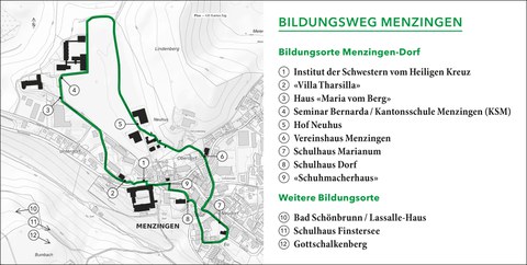 Mit dem «Bildungsweg Menzingen» laden wir Sie ein, die bemerkenswerte Bildungsgeschichte Menzingens auf einem auch landschaftlich reizvollen Rundgang zu erkunden. Dabei werden zwölf Bildungsstätten und deren Geschichte auf Schautafeln in Text und Bild gewürdigt. Dazu erscheint eine Begleitpublikation, die bei der Einwohnergemeinde Menzingen bezogen werden kann.