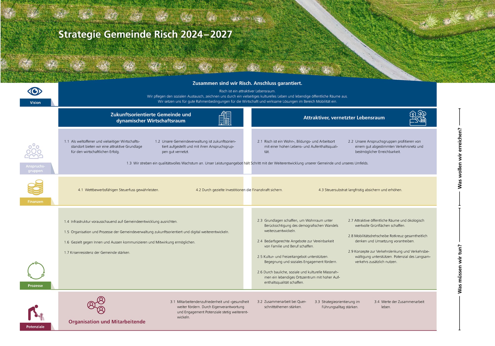 Die Gemeinde Risch strebt in den kommenden Jahren ein qualitätsvolles Wachstum an. Allen Generationen soll eine hohe Lebens- und Aufenthaltsqualität in einem attraktiven Wohn-, Bildungs- und Arbeitsort zugutekommen. Als Arbeitgeberin fördert die Gemeinde Risch die Mitarbeitendenzufriedenheit und -gesundheit. Als weltoffener und vielseitiger Wirtschaftsstandort bietet die Gemeinde eine attraktive Grundlage für den wirtschaftlichen Erfolg.
