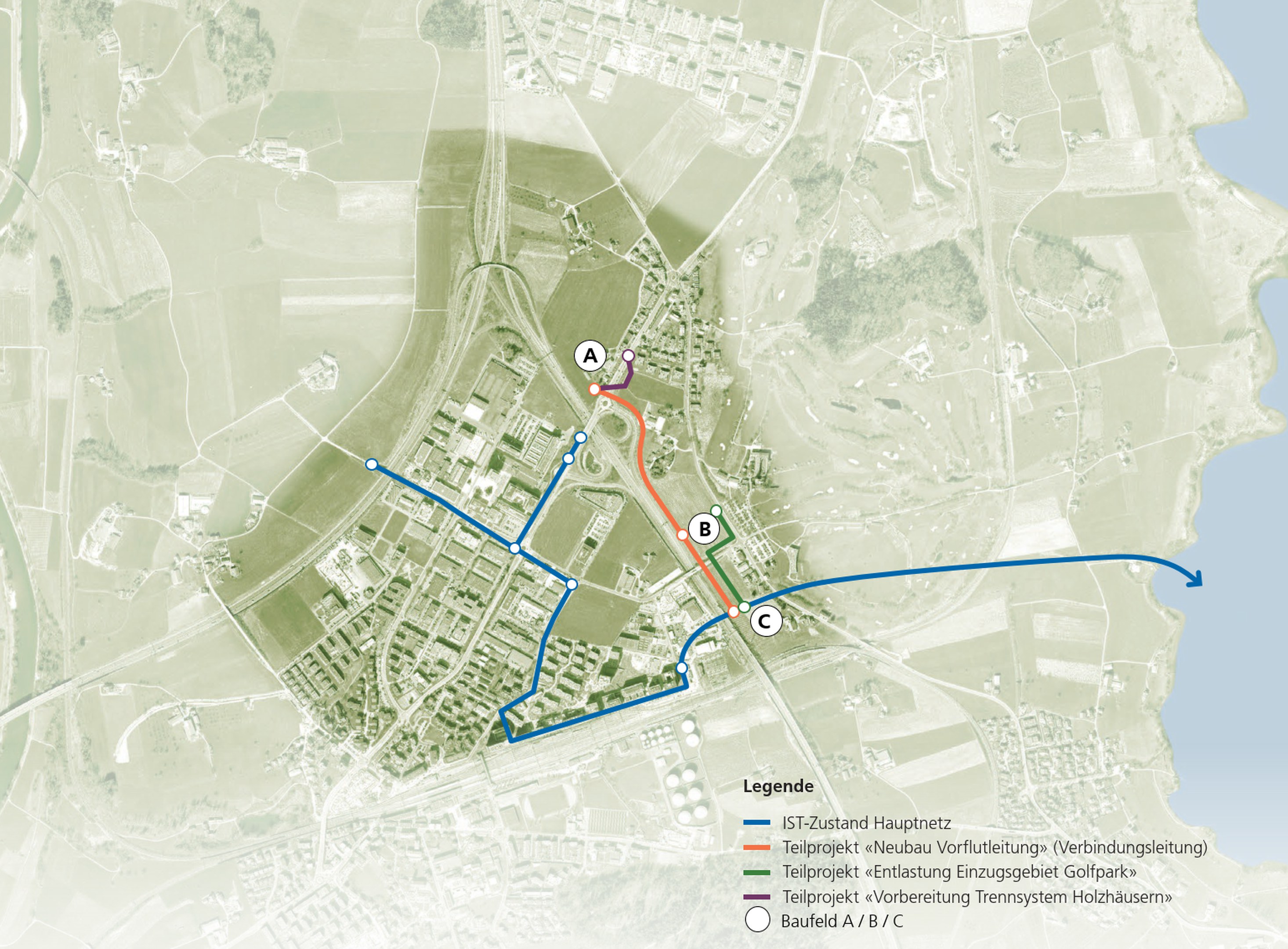 Durch den Bau der neuen Regenwasser-Verbindungsleitung können Kapazitätsreserven geschaffen, bestehende Anlagen erhalten und das Kanalsystem in Rotkreuz Nord entlastet werden. Zwei begleitende Teilprojekte – die Vorbereitung eines Trennsystems in Holzhäusern und eine Kapazitätserweiterung im Gebiet des Golfparks – sorgen für zusätzliche Verbesserungen.