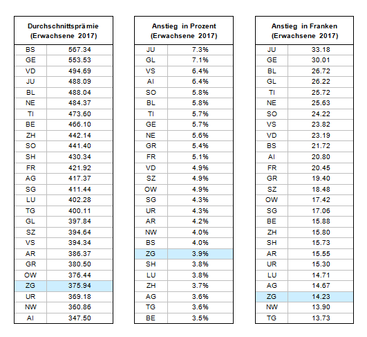 Zug neu auf Platz 4 der prämiengünstigsten Kantone