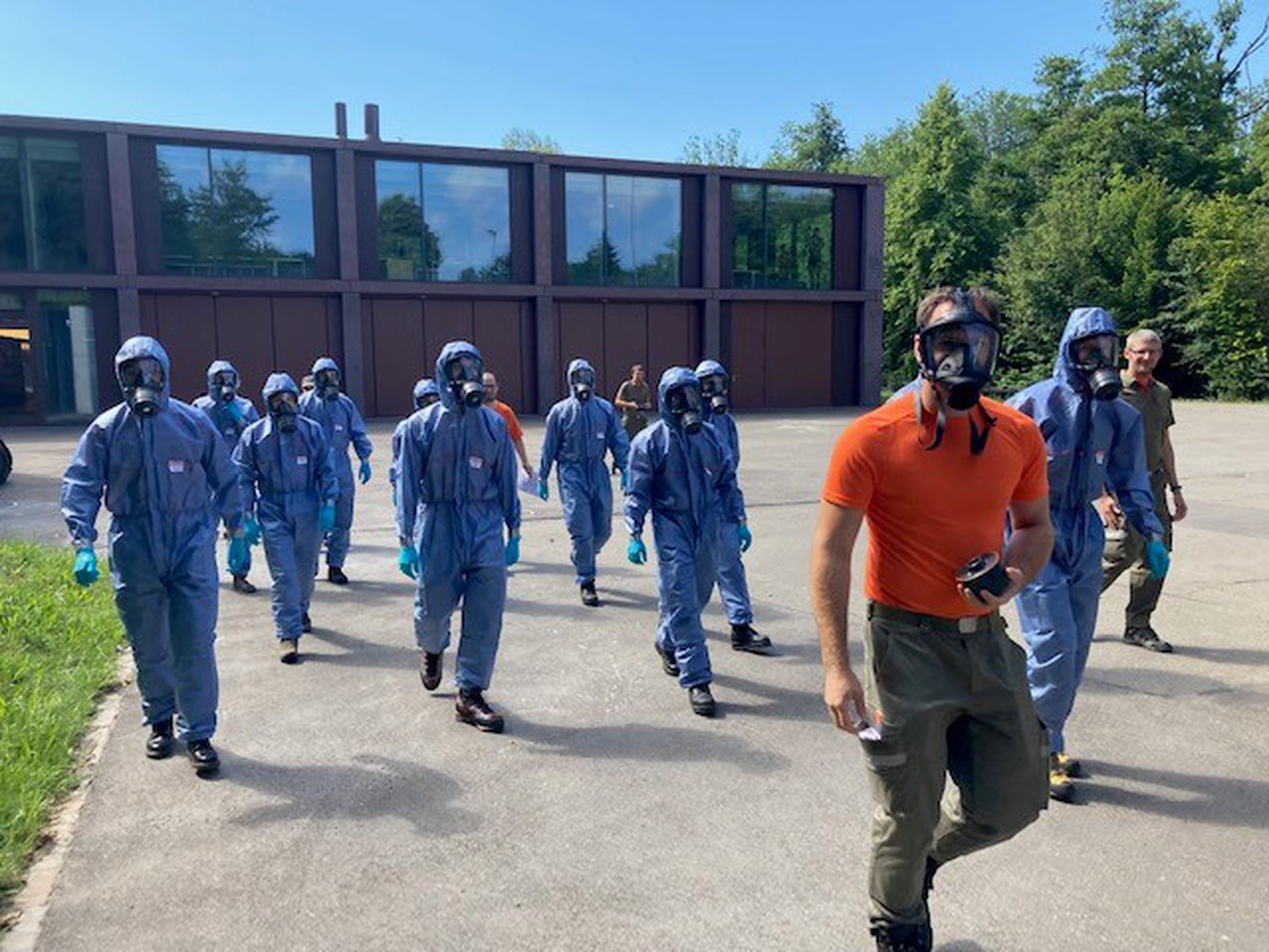 Zu Beginn des WKs wurden die Teilnehmenden in vier Gruppen eingeteilt, in denen sie verschiedene Posten durchliefen. An den ersten zwei WK-Tagen erfolgte jeweils eine halbtätige Ausbildung im Verkehrsdienst sowie im Sanitätsdienst inkl. Auffrischung von BLS/AED. Ebenfalls einen halben Tag pro Gruppe dauerte die Ausbildung im Bereich Polycom, welche mit einem Besuch von Zivilschutzanlagen im Kanton Zug verbunden wurde. Ergänzt wurden diese halbtätigen Lektionen mit zwei kürzeren Ausbildungssequenzen zum Betrieb einer Hotline und zum Thema ABC-Schutz. In der Ausbildung zum Thema ABC-Schutz lernten die Angehörigen der Betreuungskompanie das entsprechende Schutzmaterial (insbesondere Schutzanzug und Maske) und dessen korrekte Handhabung kennen und anwenden. Anhand einer praktischen Übung wurde mittels eines Testgases die Dichtigkeit der Ausrüstung überprüft, bevor dessen korrektes Retablieren den Abschluss dieser Ausbildungssequenz markierte.