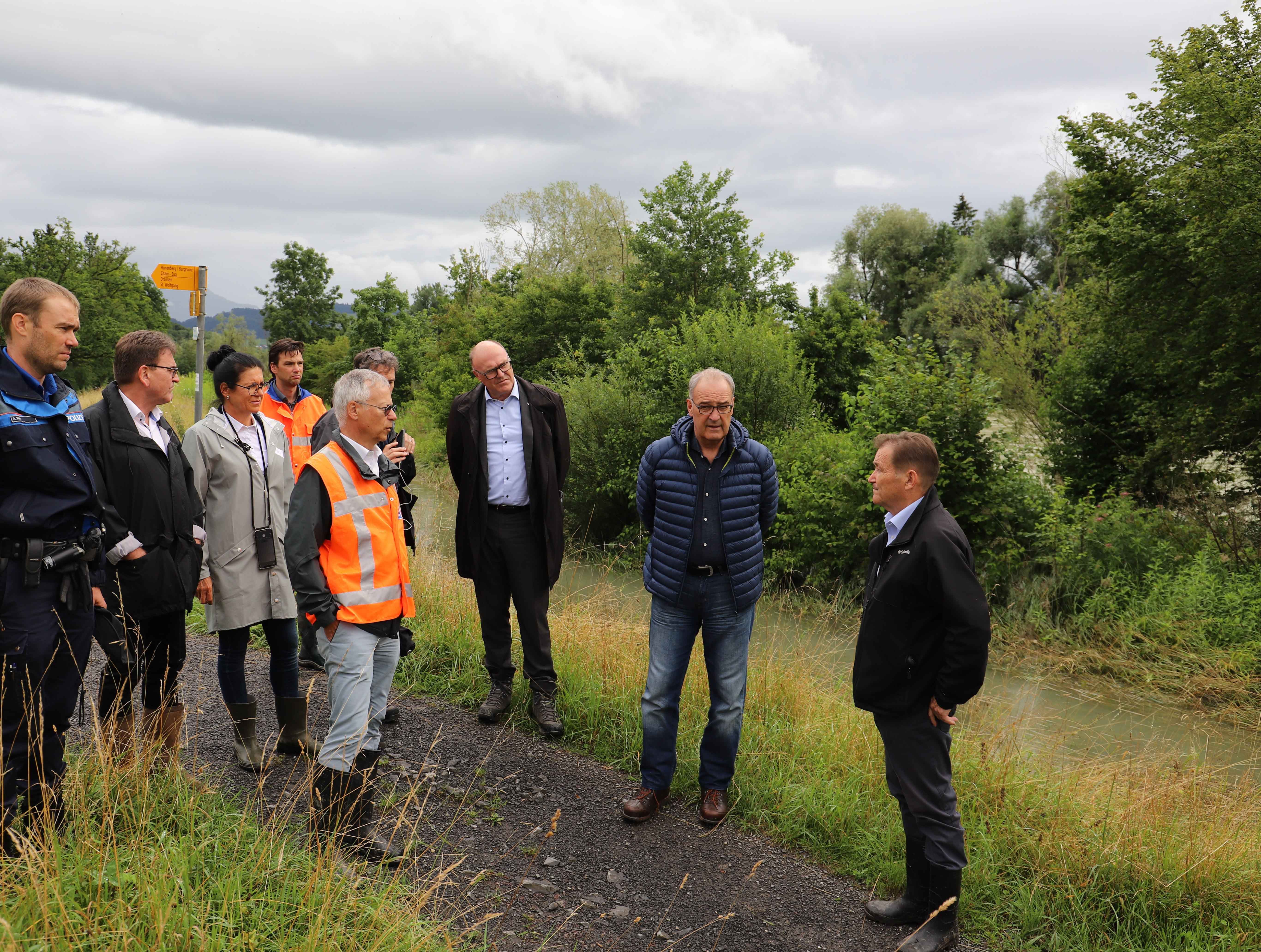 Heute besuchte Bundespräsident Guy Parmelin die Gemeinde Hünenberg, um sich persönlich ein Bild von der angespannten Hochwasserlage vor Ort zu machen. Dabei wurde er begleitet von Landammann Martin Pfister, Sicherheitsdirektor Beat Villiger, Hünenberger Gemeindepräsidentin Renate Huwyler, Hünenberger Gemeinderat Hubert Schuler sowie von Mitgliedern des gemeindlichen und des kantonalen Führungsstabs.