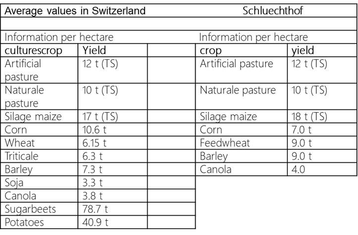 In artificial, natural meadows and maize, the yield is given in dry matter (TS). This is the yield without water. For the other crops, the actual yields are given in fresh substance. The fluctuations can be very large. For example wheat yield fluctuations of 3 to 10 tons per hectare are assumed, . depending on the weather and pest infestation,